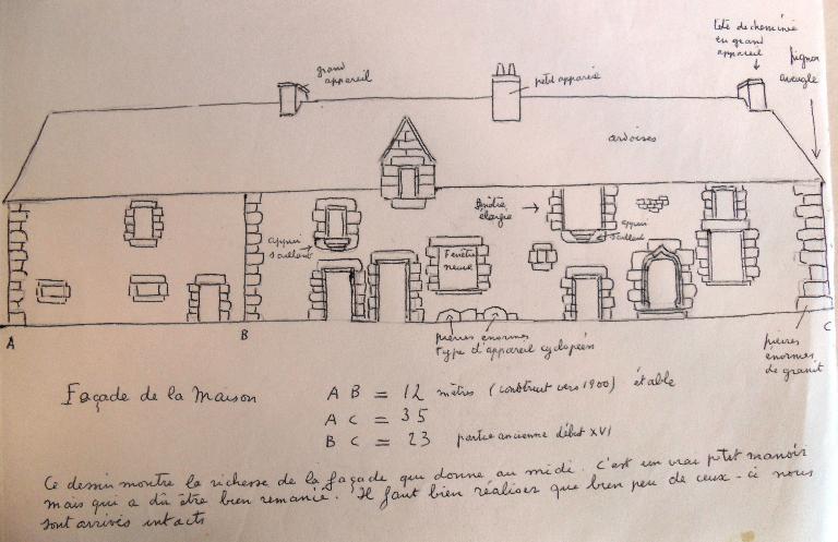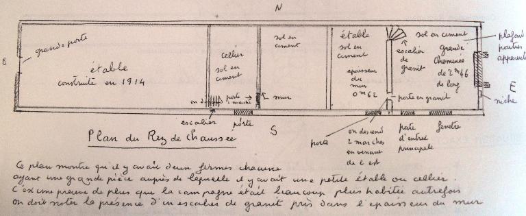 Le plan de 1968 réalisé par le service de l'inventaire du patrimoine culturel montre qu'il y avait deux fermes, chacune ayant une grande pièce dans laquelle il y avait une petite étable ou un petit cellier. Un escalier tournant en granite est pris dans l'épaisseur du mur nord de la première ferme à l’est. La cheminée en granite fut installée sur le mur pignon est.