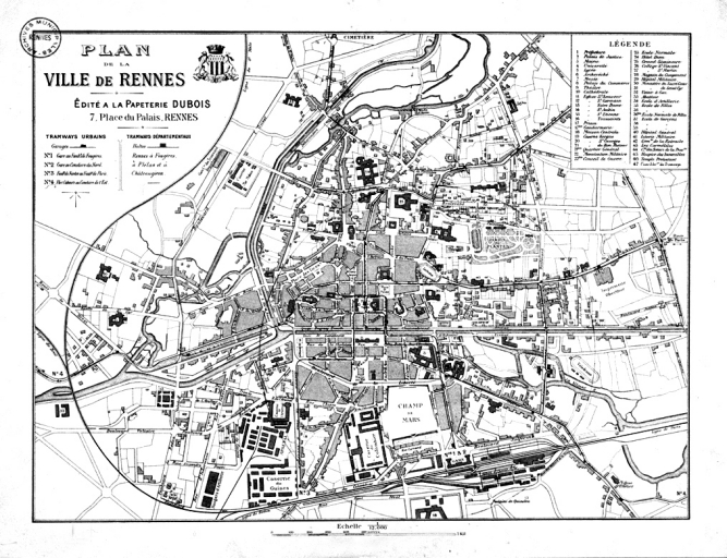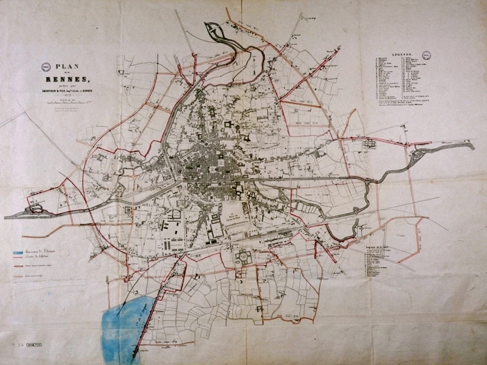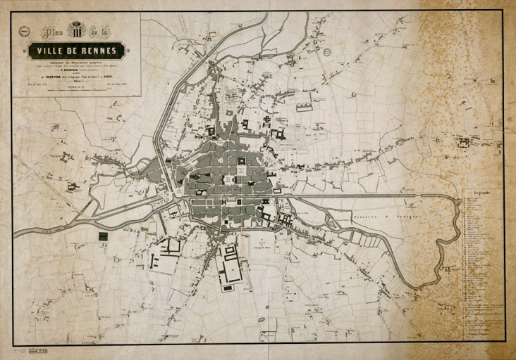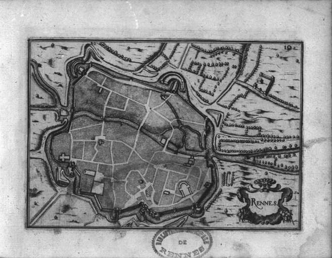 La fin du Moyen Age est marquée par une forte extension de la cité qui sera protégée par deux nouvelles enceintes entre 1428 et 1476, par l´apparition des institutions urbaines, la construction d´un beffroi, en 1467, et l´ascension de la bourgeoisie marchande et artisane qui se concrétise également par la construction de deux nouvelles halles, pont de la Poissonnerie et pont Saint-Germain. Le projet de construire une quatrième enceinte qui aurait protégé les faubourgs de la ville haute, en 1485, sera abandonné et les faubourgs seront partiellement détruits lors du siège de 1487, puis de l´aménagement des boulevards protégeant les portes de la ville. L´établissement du parlement à Rennes, décidé en 1585, et sa construction, entre 1614 et 1690, marque une étape importante de la ville où affluent de nombreux parlementaires ; en 1689, un intendant est nommé. Le démantèlement des remparts commence au début du 17e siècle par le déclassement des tours et se poursuit par le lotissement des terrains autour de la ville haute, à partir de 1657. La rue de l´Horloge et la rue d´Orléans sont aménagées au début du 17e siècle. En 1612, un nouveau pont relie la ville haute et la ville basse. Des cours sont aménagés aux abords de la ville. La ville est partiellement détruite lors de l´incendie de 1720 qui ravage le coeur marchand de la Ville-Neuve. Elle sera reconstruite sur les plans de l´ingénieur Robelin, nommé en 1721, et de l´architecte Gabriel qui lui succède, en 1724, suivant deux projets arrêtés en 1723 et en 1725. La canalisation de l´Ille, achevée en 1830, puis de la Vilaine, entre 1840 et 1860, marquent des étapes importantes du développement urbain, ainsi que l´arrivée du chemin du fer, en 1857. Dans la deuxième moitié du 19e siècle, la rénovation de la ville basse et la destruction des remparts qui la bordent, au sud, inaugurent le développement de la ville vers le sud. Au nord de la ville, la construction de l´hôtel-Dieu constituera le pivot du projet de rénovation des faubourgs, qui sera partiellement réalisé. Au sud de la Vilaine, ce sont l´abattoir, mais surtout la prison, qui constitueront les édifices structurants du développement. Le lotissement progressif des terres agricoles, d´abord au sud, puis à l´ouest et au nord-est, constitue la phase d´urbanisation entre les deux guerres. Un plan d´extension est approuvé en 1928. Après la Deuxième Guerre mondiale, la ville fait l´objet d´un plan d´urbanisme directeur, approuvé en 1951 et suivi par la création des zones d´urbanisation prioritaire, en 1959, et des universités. Selon Henri Fréville, la surface urbanisée est passée de 20 hectares, au 15e siècle, à 170 hectares à la veille de la Révolution, puis de 337 hectares en 1874 à 1300 hectares en 1939, pour atteindre 5000 hectares en 1975. En 1954, elle est augmentée de 25 hectares prélevés sur la commune voisine de Vezin-le-Coquet, pour l´aménagement de la zone industrielle de Lorient.