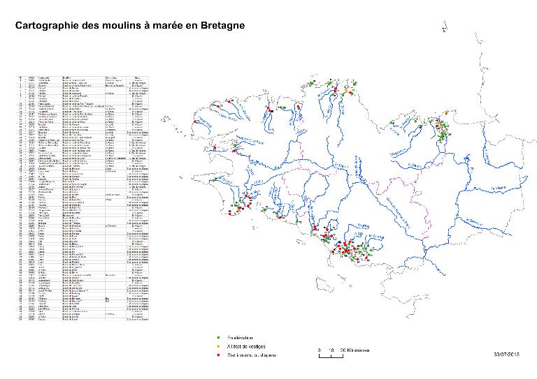 - Et enfin, pour le département de la Loire-Atlantique (44) 12 moulins à marée ont été dénombrés, tous disparus à l'exception d'un dont les fondations existent toujours sous une ancienne chapelle. Pour rappel ce département n’entre pas actuellement dans le ressort territorial de l’Inventaire de Bretagne.