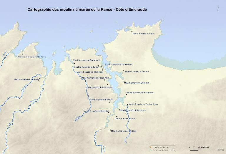 Leur implantation est ancienne : le moulin du Lupin à Saint-Coulomb est attesté dès 1181, celui de la Tourniole à Pleudihen-sur-Rance remonte au Moyen âge, ceux de Pleurtuit, le Moulin neuf date de la fin du 17e siècle et Montmarin de 1811. A Plouër-sur-Rance, on devine encore l'ancien ancrage à piles du moulin de la cale, transformé à plusieurs reprises.