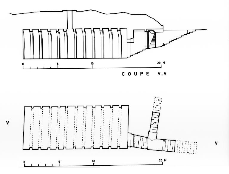 Deux escaliers perpendiculaires plongeant dans le sol permettent de parvenir à l'entrée, protégée d'une grille. Leur longueur est de 15m08, leur largeur est de 6m31 et leur hauteur est de 4m22. Des contreforts intérieurs reçoivent la retombée de 11 arcs doubleaux et soutiennent une voûte cintrée en berceau, qui est percée d'un soupirail. Les voûtes sont construites en briques, tandis que les contreforts sont en pierre de taille de granite. Le sol, recouvert autrefois d'un plancher, possède un puisard pour absorber l'humidité. On accède aux celliers au moyen de deux rampes à angle droit et d'un palier.