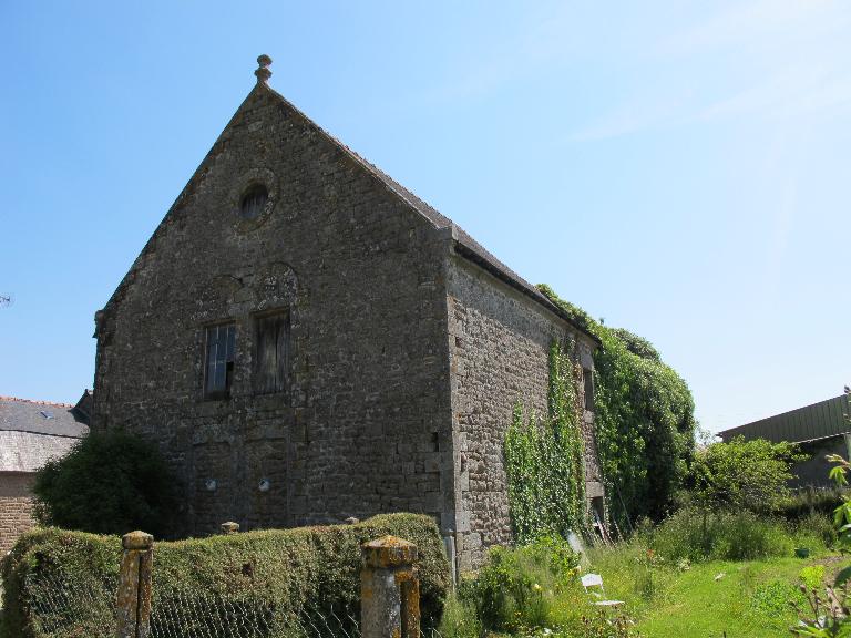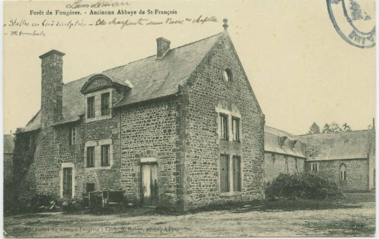 La partie inférieure doit appartenir au 15e siècle. La façade a par ailleurs visiblement été remaniée. Elle comportait six frontons à l’étage mansardé ; au premier étage six petites fenêtres devaient probablement éclairer un long couloir ; au rez-de-chaussée trois portes en anse de panier, avec chanfreins abattus en gorge et relevés en contre-pointe au milieu de l’arcade ont bien le même aspect que certaines portes des grosses tours du château de Fougères, lesquelles sont du 15e siècle. M. le chanoine Mathurin, curé-doyen de Saint-Sulpice, pense que cette façade devait vraisemblablement être précédée d’un cloître. Un mur dont on voit encore les traces au ras du sol, parallèlement à la façade, devait supporter les colonnes. Un grand nombre de pierres moulurées, toutes semblables, dont quelques-unes servent aujourd’hui de socles aux poteaux d’un hangar de la ferme, doivent provenir de ce cloître disparu.