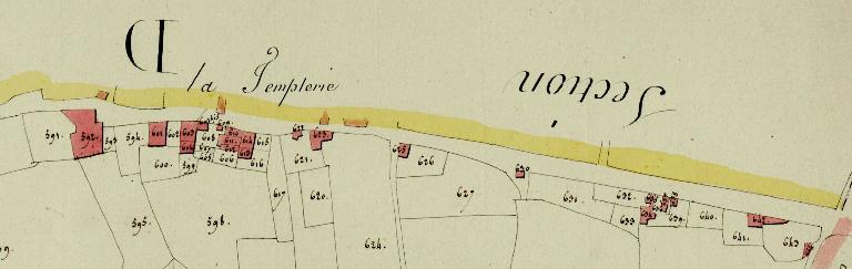 Selon A. Bertin et L. Maupillé, « les templiers possédaient sur le territoire de cette paroisse une maison qui a donné naissance au village dont le nom des Temples ou de la Templerie rappelle l’origine ». Le fief qu’y possédaient les chevaliers du Temple dépendait de la commanderie de la Guerche. Seule la toponymie a conservé la mémoire de cet épisode. Le cadastre napoléonien révèle à la Templerie l’existence d’un village déjà étoffé en 1811, formé de constructions réparties le long de l’ancienne route de Fougères à Ernée (une quarantaine de parcelles construites). L’ancienneté de l’occupation de cette zone est encore lisible dans l’architecture mais il faut noter qu’aucun bâtiment antérieur au 19e siècle n’a conservé son authenticité. Lorsqu’elles n’ont pas disparu, les constructions de l'époque moderne ont été tant remaniées qu’il est difficile de les analyser. L’usage important de pierres de remploi, provenant peut-être de la destruction du manoir des Temples et de la chapelle qui y était associée, ajoute à cette confusion. On note ainsi dans une ferme fortement modifiée au 19e siècle la présence d’une imposante cheminée dont les consoles à ressauts portent un large linteau composé de blocs assemblés en trait de Jupiter, montage couramment employé au Moyen Age. Il n’est pas exclu que cette cheminée provienne de l’ancien manoir des Temples. Quelques bâtiments (fermes, maisons) remontent à la première moitié du 19e siècle mais l’essentiel des constructions (maisons) datent de la seconde moitié du 19e siècle, du début du 20e siècle et des années 1940-1950.