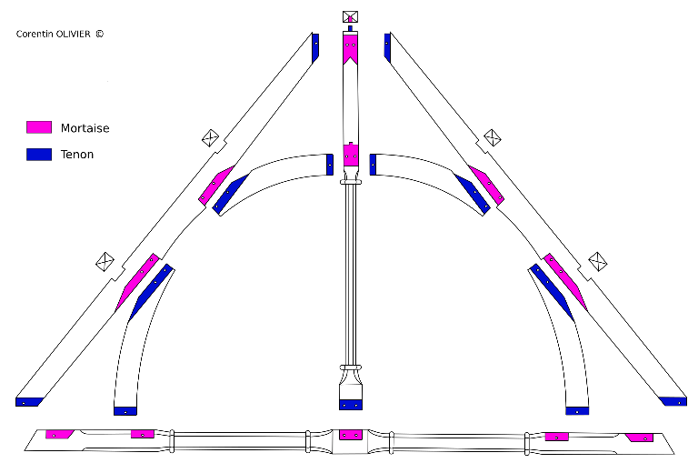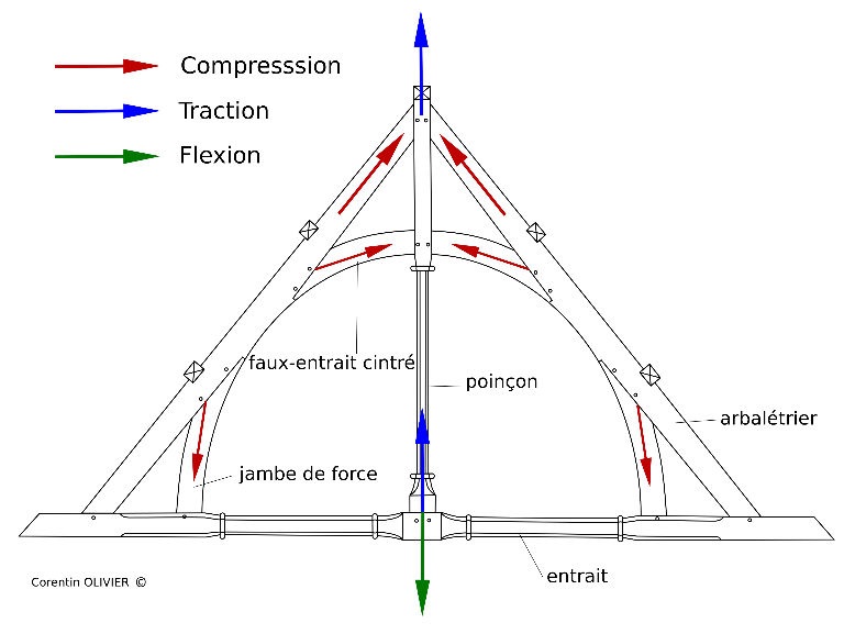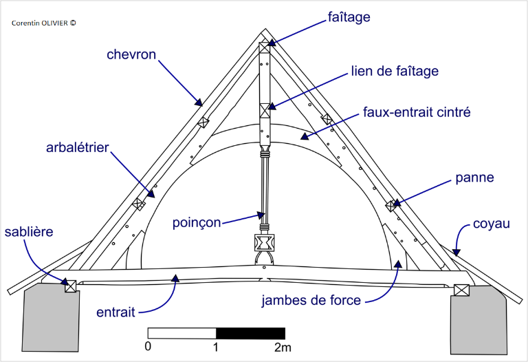 Les charpentes du XVIe siècle paraissent conserver les mêmes dimensions et sections de bois que pour les exemples armoricains. Pourtant les jambes de force et les aisseliers sont rarement présents pour cette période. Il est donc prouvé que la forte section des arbalétriers dans le plan des fermes suffit à elle seule à supporter les charges de la toiture. Ainsi les jambes de forces et les aisseliers sont employés dans le genre armoricain dans un but presqu’uniquement décoratif, servant à la réalisation de l’intrados et à l’harmonie générale des fermes.