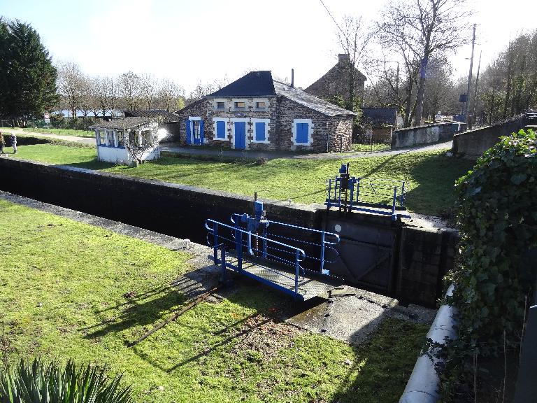 Parmi ces différentes architectures du génie civil se trouve la maison de l‘éclusier, dit aussi la maison éclusière. Cet édifice sert principalement de logement pour l’éclusier, mais aussi de poste de garde. Le bâtiment, face à la Vilaine, se compose d’un corps central flanqué de deux appentis et surmonté d’une couverture en croupe. Le corps principal comporte un rez-de-chaussée et un étage carré, le tout étant ordonnancé en trois travées régulières. A proximité, une petite annexe abrite le poste de commande permettant l’ouverture ou la fermeture des porte de l’écluse.