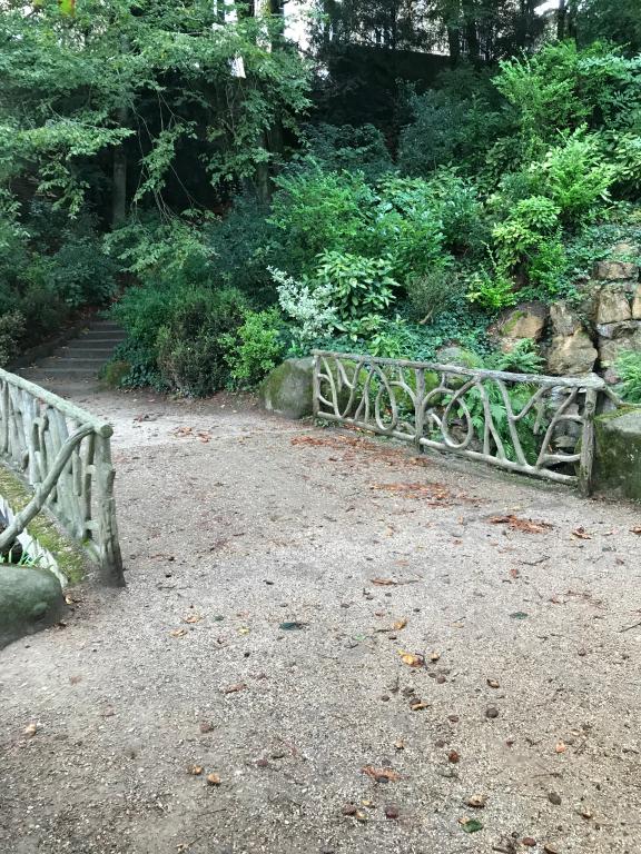 Ce parcours pittoresque est aménagé par l'ingénieur horticole M. Marc et le rocailleur rennais M. Neveu qui réalisent en béton, imitant l'aspect du bois ou de la roche, des éléments tels que des rochers artificiels, des emmarchements, plusieurs ponts et une grotte, auxquels sont ajoutés cours d'eau et deux cascades. Une île artificielle est aménagée sur le parcours du ruisseau sinueux qui coule des cascades, accessible par un pont, elle est aujourd'hui discrètement dissimulée dans la végétation. En 1904, la rivière "anglaise" du projet Bühler qui serpentait au sud du jardin paysager (le cours d'eau était resté inachevé) est supprimée à l'occasion de ces nouveaux aménagements.