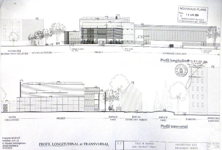 L'équipement sportif Constant Véron se compose de deux éléments. Au nord-est, l'ancien gymnase du groupe scolaire Brest-Verdun a été construit en 1968 dans le cadre d'une commande groupée : plans fournis par le cabinet Architecture & Bâtiment, arrêté d'approbation technique le 15 juin 1966, subvention de 438 000 F au taux de 65% le 28 février 1967, marché passé avec l'entreprise Tible de Granville le 20 mai suivant, ouverture du chantier le 1er août, réception des travaux le 12 février 1968. A ce premier bâtiment, rebaptisé gymnase de l'Ille, a été adjoint au sud-ouest, près de quarante ans plus tard, un second, sur deux niveaux, conçu par F. Michot : permis de construire délivré le 14 septembre 2004, début des travaux le 4 avril 2005, achèvement le 28 avril 2006, pour un coût de 1 488 406 € TTC.