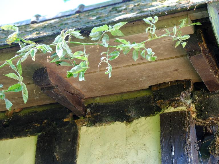 La forme des toits est à deux versants ou à croupe et coyau, avec une couverture en ardoise. L'entablement est constitué de corbelets en bois sculptés qui soutiennent en surplomb une planche à moineaux.