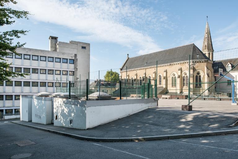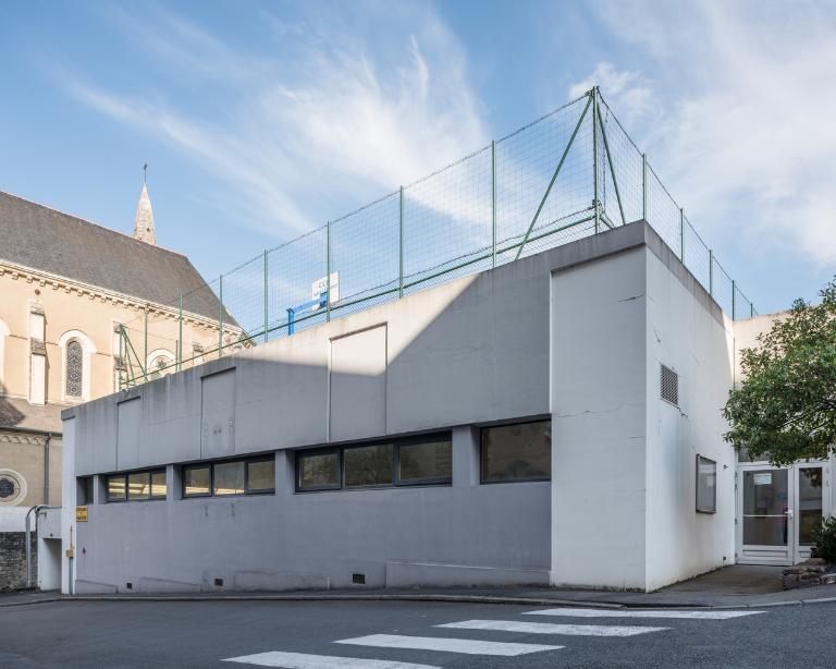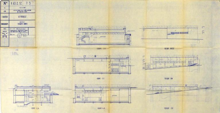 Pour ce gymnase scolaire du milieu des années 1960, l'architecte départemental J. Lemercier a tiré parti du dénivelé du terrain pour installer un plateau d'évolution sur le toit terrasse.