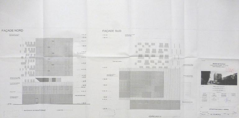 Le centre sportif, situé au sud de la parcelle côté esplanade, s’organise sur trois niveaux. Le rez-de-chaussée comprend le hall et le bureau d’accueil, ainsi que la salle de sports d’opposition (278 m2). Le grand gymnase (692 m2) est au premier étage, ses vestiaires sont placés sur deux niveaux superposés. La salle d’activité physique et sportive (323 m2) est placée en haut, au-dessus du gymnase. Les trois niveaux sont distribués par un escalier et un ascenseur placés en façade sud. Entièrement vitrée avec des lames de verre orientable de type Naco, celle-ci a un système de pare-soleil inversé par rapport aux autres éléments du complexe : les éléments verticaux deviennent horizontaux pour une meilleure efficacité, introduisant dans la composition une variation graphique issue d’une nécessité climatique . Les pare-soleil sont interrompus pour dégager trois loggias qui laissent voir depuis la place l’activité à l’intérieur. Une partie de la toiture est végétalisée.