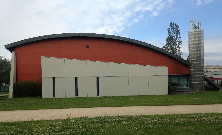 Le profil en arc de cercle confère une belle tension au bâtiment, la structure constituée de neuf fines poutres en lamellé-collé se prolongeant à l'extérieur en façade nord pour former visuellement des sortes d'arcs-boutants. La façade sud est généreusement vitrée. Les murs sont en béton, revêtus à l'intérieur de plaques de bois stratifié et à l'extérieur d'un bardage en aluminium. En 1984, les éléments éclairant ponctuellement le gymnase, constitués à l'origine de plaques en plastique léger, ont été remplacés par des double parois en polycarbonate.