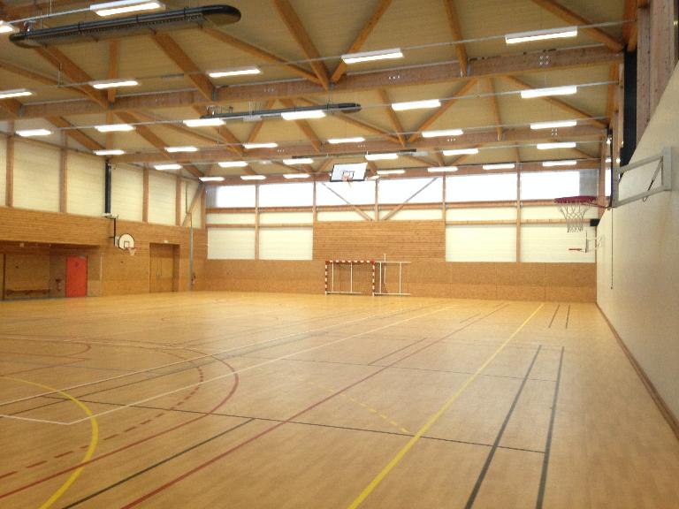 Equipement récent dont la couverture à sheds confère un éclairage optimal à la salle de sports et une silhouette mouvementée bien intégrée dans le paysage environnant.