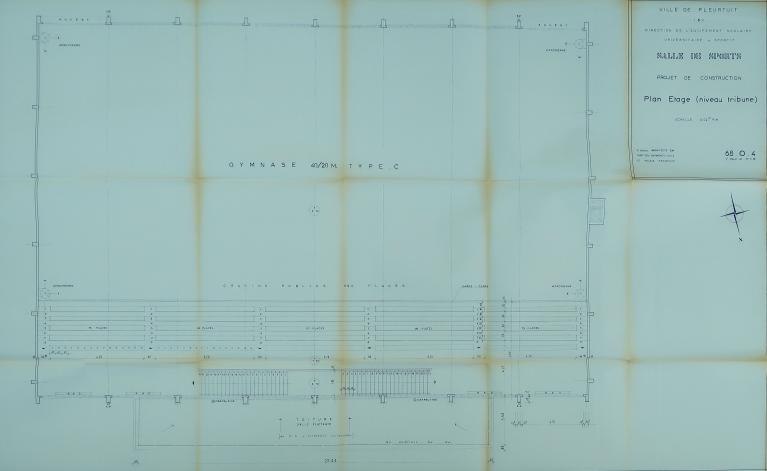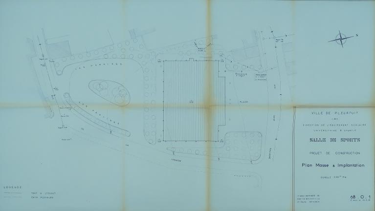 "En plein centre de la ville, la construction sera édifiée sur une place bien dégagée, bordée sur trois côtés par la voie publique, l'accès principal étant la rue Saint-Guillaume en partie nord. [...] La composition générale prévoit l'implantation d'un gymnase du type C (40 x 20) et de ses annexes, de façon à dégager au nord une place pour l'accès principal et le développement des cortèges et manifestations ; au sud une place avec espaces verts pour les parkings, avec dégagement par la rue de la Perrière. la construction est prévue en application des normes des constructions sportives et sera exécutée en matériaux durs et de bon aspect, comme précisé au devis descriptif sommaire." (rapport de présentation, 17 février 1966)