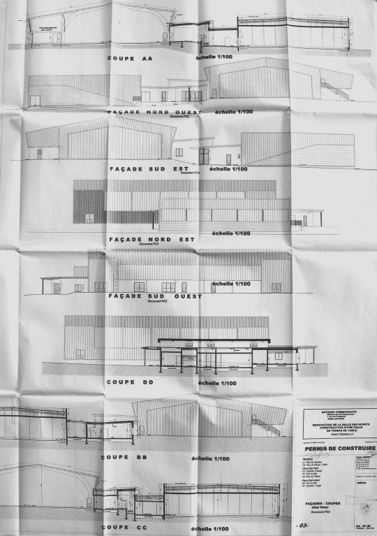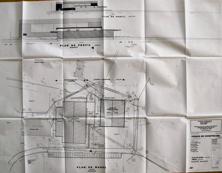 Le programme initial comprenait au rez-de-chaussée une salle principale de 948 m2 (avec ses annexes fonctionnelles) permettant la pratique du volley, basket, hand-ball et tennis ; à l’étage, une salle de 219 m2 destinée essentiellement au tennis de table. Murs en béton banché, bardage double sur ossature charpente, fermes en lamellé-collé tous les 6 mètres, couverture en tôle ondulée amiante-ciment. La campagne de travaux de 2010 lui a adjoint au nord-est une salle de tennis de table de 639,02 m2 et une zone centrale abritant un foyer avec réserve, un local matériel, des vestiaires et sanitaires, un bureau-infirmerie et une chaufferie bois.