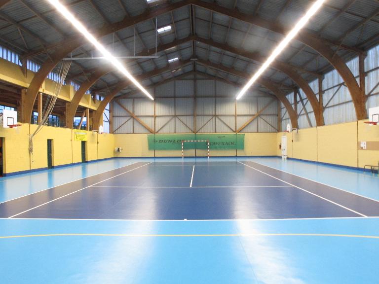 Salle rectangulaire dont l'angle sud-est est enveloppé par une aile basse en L abritant les vestiaires-douches.