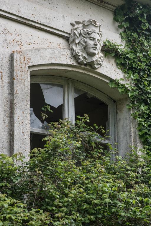 - Fenêtres hautes à linteau segmentaire, surmontées de mascarons (motif représentant un visage humanoïde faisant une grimace ou expression autre)