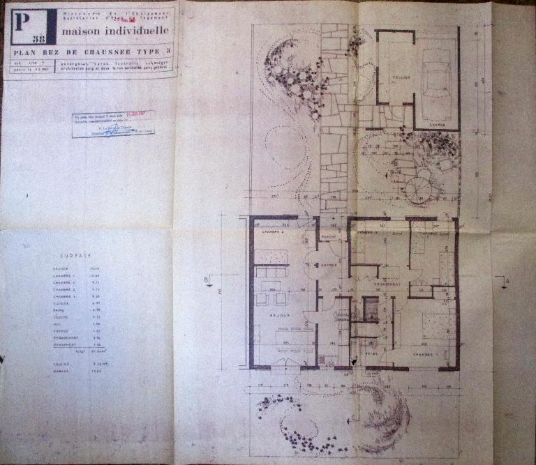 La maison comporte un hall d’entrée, une cuisine, un séjour, 4 chambres, une salle d’eau et des toilettes. Les impératifs matériels et esthétiques décrits dans le permis de construire illustrent le souci hygiéniste du Service Départemental de la Santé et du Ministère de la Construction après la Seconde Guerre mondiale. Ces institutions réglementent les installations des constructions. La maison est enduite de couleur blanche et les menuiseries sont peintes de couleur grise afin de respecter l’impératif de « teinte neutre claire ». Elle est dotée d’une fosse septique pour récolter les eaux usées, de l’électricité, d’un équipement sanitaire et ménager, ainsi que d’un système de ventilation dans la cuisine, la salle d’eau et les WC pour assurer le renouvellement de l’air. Ces installations tendent à devenir la norme dans les années 1960 et 1970 mais constituent encore des symboles de modernité. La maison possède également un cellier et un garage, fleuron de la construction des années 1960 démontrant l’importance qu’a pris l’automobile.