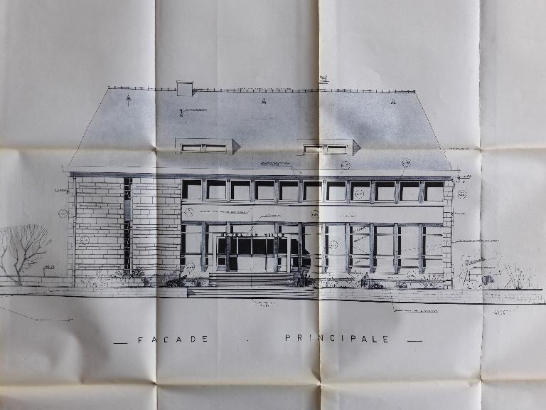 L’architecture du bâtiment répond aux codes du mouvement moderne. Le bâtiment est de plan rectangulaire et se développe en R+1 plus combles. La construction en béton, est peinte en blanc là où les ouvertures sont présentes. Ailleurs, un parement de granit gris viens habillé les façades. La composition des façades est régulière entre le rez-de-chaussée et l'étage, avec fenêtres en bandes au R+1. L'entrée principale, côté place, est centrale et se fait par un escalier droit à palier. Une corniche saillante vient délimiter les élévations d’une toiture à croupes recouverte d'ardoise, présentant deux lucarnes en longueur et deux souches de cheminées dans les murs de refends centraux. On peut remarquer le travail de vitrail sur la fente verticale de la façade sud.