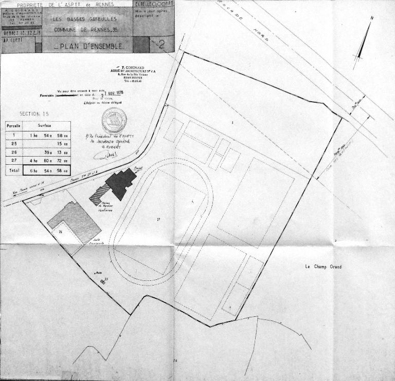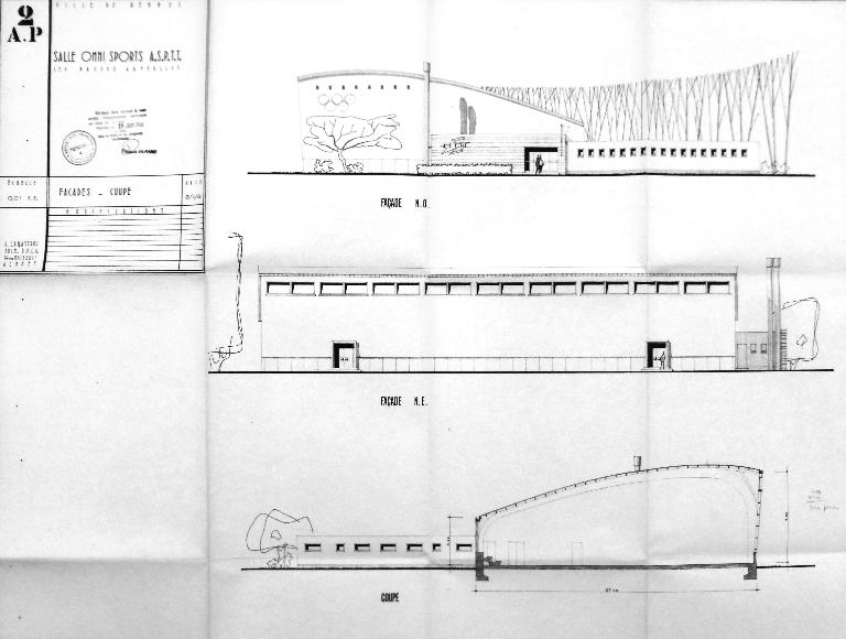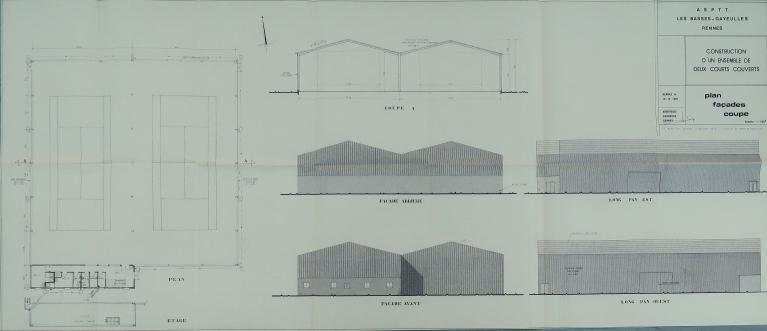 L'ASPTT s'installe en 1964 sur un terrain de 6 hectares au lieu-dit Les Basses Gayeulles. Deux ans plus tard, l'architecte rennais G. Labastrou établit un projet de salle omnisports qui fait l'objet d'un arrêté d'approbation technique le 20 juin 1967 et d'une promesse de subvention de 187 000 F au taux de 25% le 26. Le permis de construire est délivré le 22 août 1968 et la réception définitive prononcée le 13 janvier 1970. Cette tranche de travaux comprend également un logement de gardien, des vestiaires et une salle d'éducation physique (cette dernière ne sera pas réalisée pour des raisons budgétaires). En 1979, l'ensemble sportif est complété par la création d'un foyer, d'une salle de réunion, d'une salle de tennis de table et d'une salle d’éducation physique, ainsi que des vestiaires, sanitaires et réserves nécessaires, conçus par P. Coignard. Enfin, en 1983, des tennis couverts conçus par M. Derrouch sont mis en service au nord-est du site.