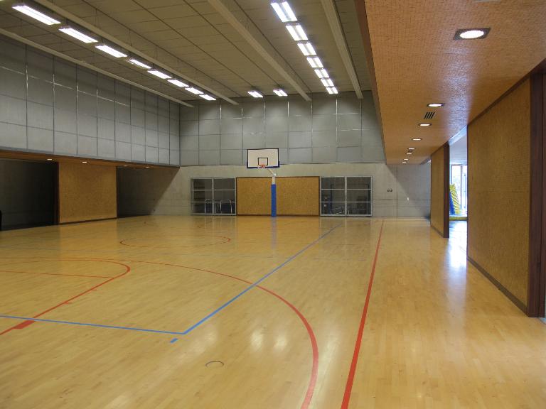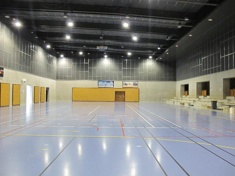 Pour atténuer fortement les nuisances acoustiques dues au boulevard, le volume de la grande salle de sport n’est pas percé. Cela a comme conséquence que cette salle est éclairée artificiellement, avec un contrôle fin de la lumière selon les sports et les usages du lieu.