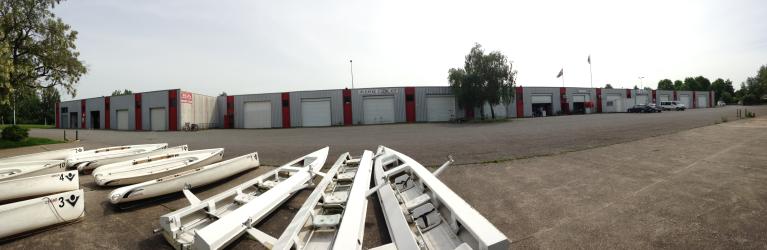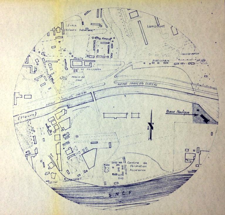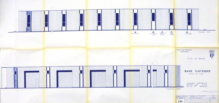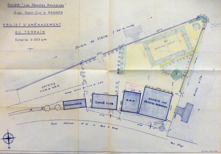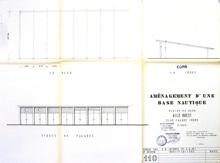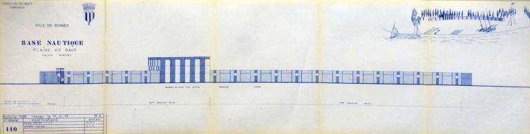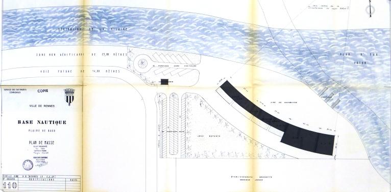 Fondée en 1867, la Société des Régates rennaises - la plus ancienne association sportive de la ville - disposa longtemps d'un centre d’entraînement sur la cale Saint-Cyr, 101 avenue du Mail. Sinistré le 4 août 1944 avec la totalité du parc de bateaux, son hangar fit l'objet d'un projet de reconstruction daté du 18 novembre 1949. Le nouveau local fut inauguré le 2 mai 1954. Dans les années 1960, la couverture d'une partie de la Vilaine détermine la ville à créer un bassin artificiel à l'est de Rennes et à y transférer le centre d'entraînement de la SRR. Le 16 janvier 1970, le conseil municipal approuve l’avant-projet de centre nautique de la plaine de Baud, préparé par le service des Bâtiments communaux et comportant les aménagements suivants : construction d’un important ensemble orienté nord-est, sud-ouest, comprenant au rez-de-chaussée des abris pour bateaux, tank à rames et chaufferie ; au premier étage, partie est, sanitaires, vestiaires, douches, une terrasse pouvant recevoir des spectateurs ; au second étage, locaux administratifs, dortoirs et vestiaires. Des parkings, espaces verts et aires de jeux sont également prévus. Le devis estimatif fait apparaître une dépense globale de 4 200 000 F. L'arrêté d'approbation technique est signé le 11 juin suivant, et le permis de construire le 9 juillet 1971. L'opération est décomposée en trois tranches fonctionnelles : 1° construction d’un pavillon pour le concierge et d’une partie des abris à bateaux de l'aile ouest ; 2° achèvement de l'aile ouest et bâtiment principal (aile est) : aménagement de bureaux, d’ateliers, de locaux de rangement, de sanitaires et de vestiaires ; 3° réalisation d’un garage à bateaux supplémentaire. La réception provisoire de cette dernière est prononcée le 15 décembre 1975.