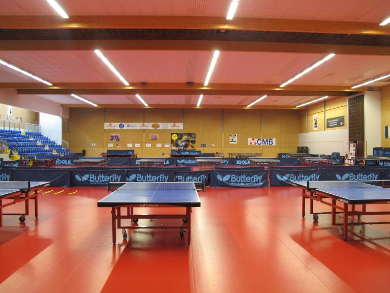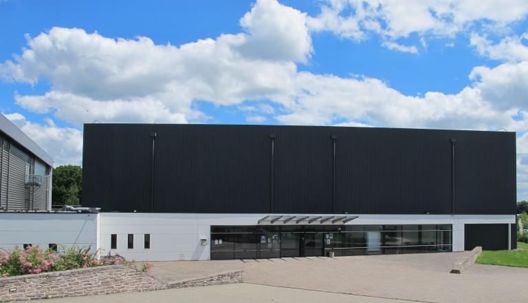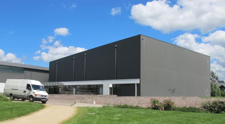 "Le projet est composé de deux volumes principaux (les deux plateaux sportifs), articulés entre eux par un 3e volume (hall, vestiaires et autres espaces de services), selon un angle dû à la configuration du terrain et aux prospects périphériques. Au nord, en bordure de la rue des Moulins, l'architecture et les matériaux choisis visent à rendre le volume abritant la salle de tennis de table plus "urbain" : la couverture à faible pente est recouverte en zinc, le bâtiment est enterré quasiment jusqu'à mi-hauteur (afin de ne plus culminer qu'à 4,30 m au-dessus de l'aménagement paysager qui borde la rue), les façades alternent des parties traitées en bardage métallique et d'autres en béton lasuré. Le but est d'atténuer l'effet "hors échelle" que la construction pourrait avoir par rapport à la rue. Au sud, le second volume est volontairement simple, répondant aux exigences sportives, techniques et financières. Du fait de la pente assez forte de la parcelle, la salle omnisports sera posée sur une plateforme dont les amples talutages permettront un aménagement paysagé de mise en valeur. Le choix d'une couleur neutre pour le bardage métallique permettra à ce second bâtiment de s'élever avec une relative discrétion sur le fond des arbres existants, en arrière-plan du 1er bâtiment par rapport à la rue des Moulins et derrière un rideau d'arbres et à bonne distance du futur axe est-ouest de la ZAC. A l'articulation de ces deux premières parties, le 3e volume abritera tous les autres locaux, essentiellement en béton lasuré, de plus faible hauteur (environ 3,60 m), permettra d'atténuer l'impact visuel des salles lorsqu'on s'approchera du projet, permettant ainsi de retrouver une échelle plus proche de celle du piéton." (F. Michot, Notice paysagère, décembre 2005)