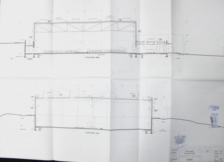 Bel équipement contemporain comportant une salle de sports (tennis, badminton) de plan rectangulaire précédée de deux espaces de forme ovoïde abritant respectivement les vestiaires et une salle de boules/palets.