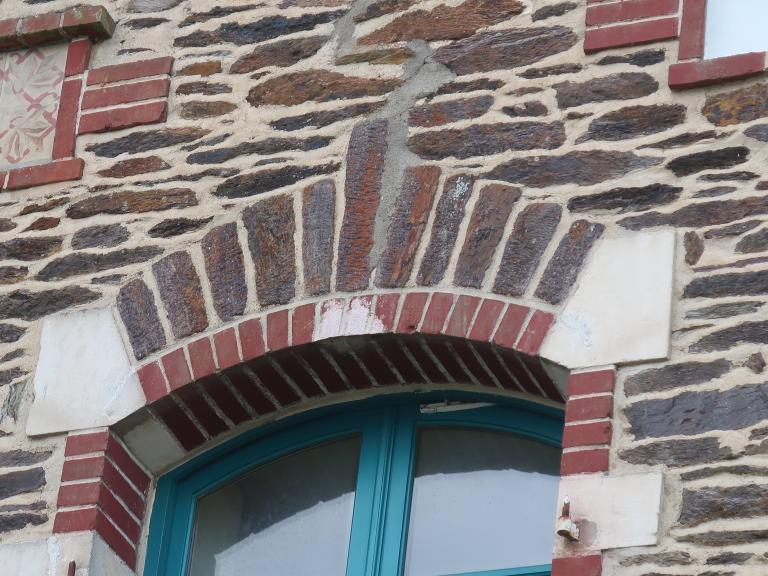 Les plans sont réalisés par Charles Coüasnon, un architecte rennais. Le style de l’édifice se rapproche des constructions urbaines rennaises de la même époque. La gendarmerie adopte un plan rectangulaire marqué par deux avant-corps aux extrémités. La façade antérieure est définie par cinq travées et un niveau de soubassement. Ce dernier se distingue par une mise en œuvre soignée du schiste pourpre. Un bandeau enduit couronne l’élévation et marque l’horizontalité de la façade. A l’inverse, les imposantes souches de cheminées en brique soulignent la verticalité et s’imposent dans le paysage. La particularité architecturale de la gendarmerie repose dans le traitement des claveaux des arcs surbaissés. Ce sont des petites pierres de taille en schiste pourpre, matériau difficile à tailler, dont la clé de voûte est marquée. En 1909, la façade antérieure était orientée sur la rue et la porte d’entrée était en travée centrale.
