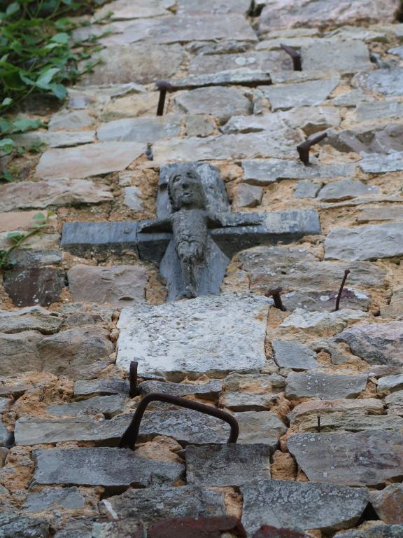 Le nom de la chapelle fait référence à un crucifix du 18e siècle. Le recteur de l’époque, Monsieur Porchet, taille l’objet dans un schiste ardoisier pour assurer la protection de la paroisse contre une épidémie de dysenterie. A la construction de la chapelle en 1891, il est intégré à la maçonnerie, au-dessus de la porte. Auparavant, il était abrité dans un coffret en bois, en hauteur dans un chêne. Le chanfrein du crucifix pose question, pouvant indiquer que l'objet est un vestige de croix de chemin du 18e siècle.