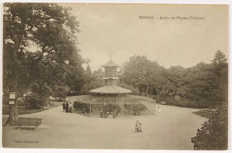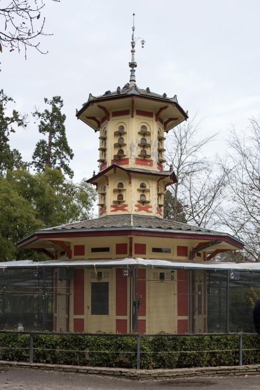 Jean-Baptiste Martenot, architecte de la ville, construit en 1876 une volière à l'emplacement d'une butte de terre nommée "cavalier", au sud-ouest du jardin à la française. Cette fabrique de jardin possède une silhouette de "pagode" (en forme de pavillon chinois ou japonais) qui lui confère un caractère singulier.