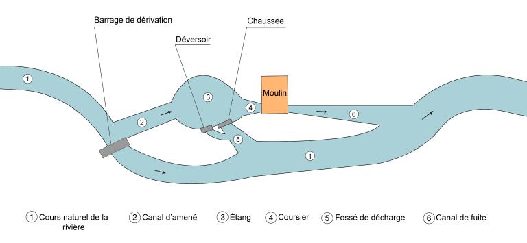 - Canal de fuite : canal permettant à l’eau de rejoindre la rivière après avoir actionnée la roue