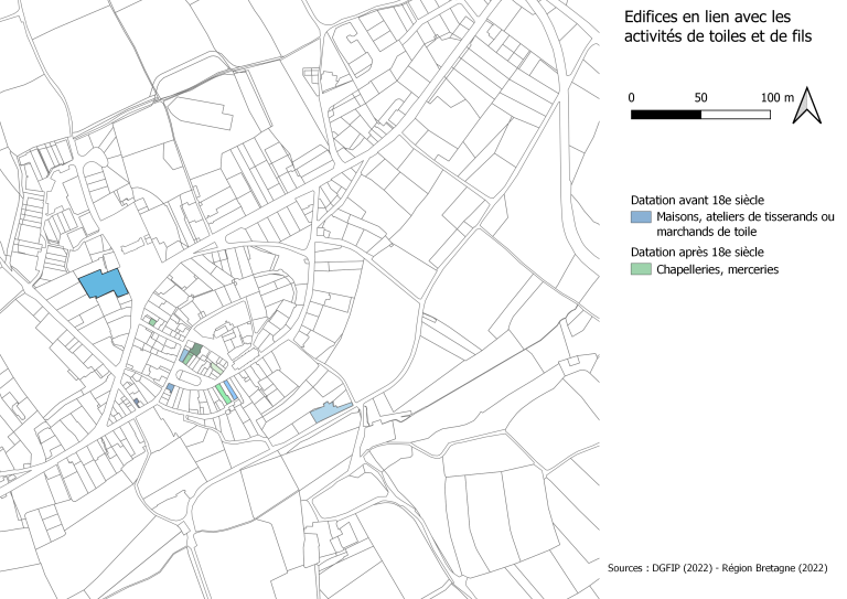 Acteurs d’une proto-industrie textile, des tisserands et marchands de toiles sont par ailleurs présents à Bécherel dès le XVIe siècle, le fond de vallon occupé par une succession d’étangs étant propice au rouissage du lin et du chanvre. Au siècle suivant, la ville est le lieu de production d’un des meilleurs fils de Bretagne, et l’enceinte fortifiée protège les négociants de toiles et les marchands qui viennent vendre et s’approvisionner au marché hebdomadaire sous les halles médiévales. Les tisserands s’installent à l’intérieur de la ville, et les marchands de toiles dans des demeures de prestige, à l’extérieur, comme celles de la Ville Malet et du 3-5 route de Linquéniac, dont les façades avec moulures d’encadrement de la porte et les corniches à modillons de pierres sculptées témoignent de l’aisance financière de leur propriétaire. Les marchands de tissus ou de fils disposent d’une maison d’habitation en profondeur et d’un atelier en fond de cour, avec une poulie qui facilite le stockage des fils (de lin et de chanvre) au grenier (par exemple, au 11 rue de la Filanderie). Un étage de réception, est présent au premier étage. Des marques de marchands de toiles sont encore visibles sur les linteaux de certaines maisons, comme au 4 Place de la Croix, à l’arrière du bâtiment. A proximité de la Rance, des ports de Dinan et Saint-Malo, les tanneurs, les tisserands et marchands de toiles nourrissent l’activité maritime, comme la production de toiles de chanvre et de cuirs pour la marine.