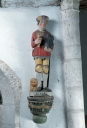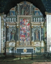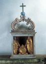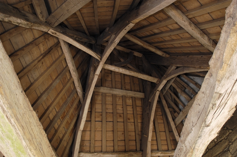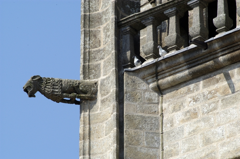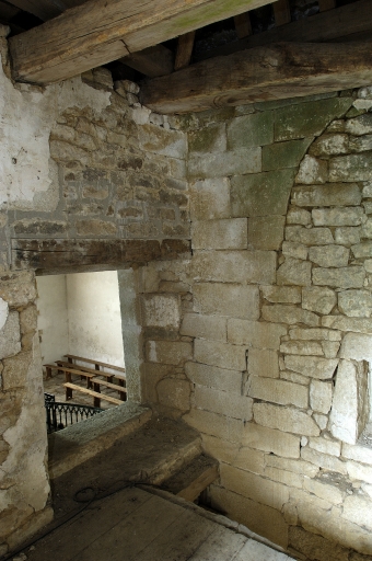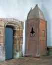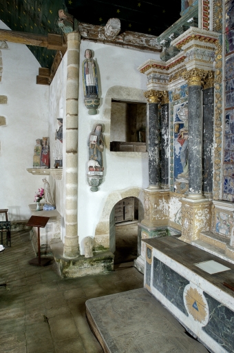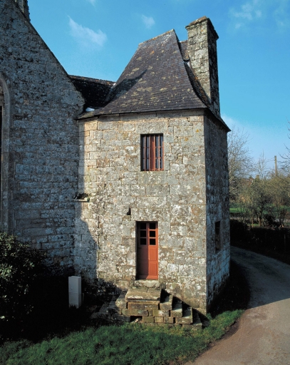 Située sur l'angle nord-est, la sacristie à étage est rajoutée à la fin du 17e siècle, peut-être en 1680, en même temps que le retable. A l'étage, la présence d'une cheminée et d'une baie ouverte sur le choeur pour suivre les offices suggèrent l'existence d'une tribune seigneuriale. Cet élément rapporté, loin de rompre l'unité du monument, contribue à lui donner vie dans un système architectural où chaque forme acquiert sa propre valeur du fait de sa démesure ou de son décor. Ainsi, clocher-porche, portail sud et sacristie semblent autonomes par rapport au noyau central devenu simple lien entre ces éléments de prestige.