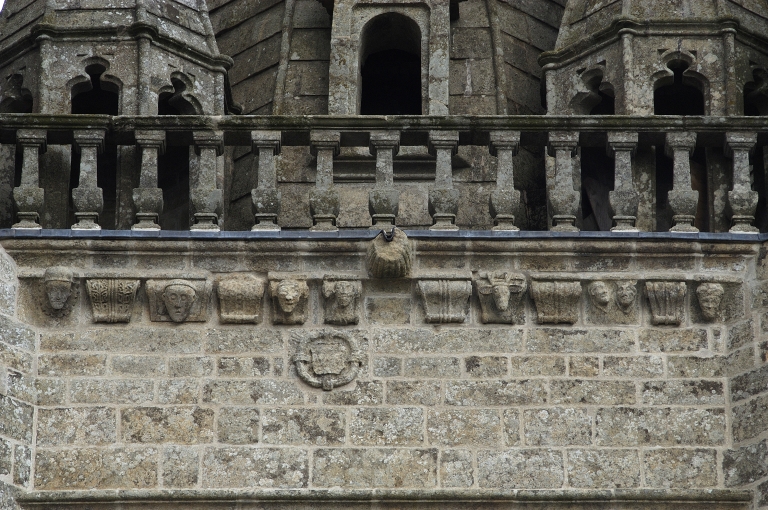 Notre-Dame de Locmaria présente de nombreuses analogies avec les édifices religieux d'importance édifiés sur le territoire des Rohan. A la simplicité et la modestie de la nef correspond le développement hors d'échelle de la tour-porche, comme à Saint-Nicodème en Pluméliau, Notre-Dame de la Houssaye en Pontivy ou Notre-Dame de Quelven en Guern. Bien qu'issue d'un programme plus ambitieux, antérieur d'une trentaine d'années, cette dernière a servi de modèle à Locmaria. On y retrouve, si fréquent dans le Vannetais, le thème du portail sud à baies jumelées surmonté d'un fenestrage dont l'origine ligérienne est incontestable. Le décor s'y concentre sous forme de bestiaire fantastique aux expressions satiriques dans l'esprit du Moyen Âge. Quelques détails dans ce répertoire gothique flamboyant indiquent une date avancée dans le 16e siècle : le traitement épuré du réseau de soufflets et de flammes, l'absence de redents dans le fenestrage, la présence de pilastres à la base des pinacles. Dans la tour, les baies cintrées sont encadrées de pilastres ornés de losanges et de cercles, motifs de la première Renaissance et allusion possible aux armoiries des Rohan.