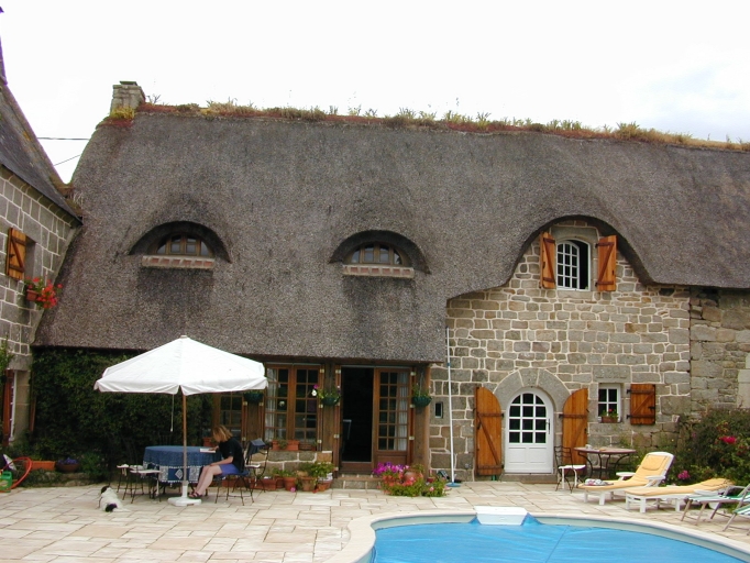 La ferme adopte un plan en L. Elle regroupe un logis à étage avec une pièce habitable par niveau et une partie construite en retour à étage également. Le logis proprement dit présente une élévation ordonnancée en pierre de taille inspirée par les façades des manoirs. Il est couvert en ardoise. La tourelle en demi-hors-oeuvre qui abrite l'escalier en vis sur la façade postérieure est jumelée avec le conduit des latrines et couvert en appentis. A l'étage, la chambre à feu est éclairée par trois fenêtres dont une percée sur le pignon et une munie de coussièges, accostée d'un placard mural. Le bâtiment en retour construit en moellon équarri communique avec le logis mais les profonds remaniements qu'il a subis rendent difficile son analyse. La présence d'une cheminée et d'un placard à quatre cavités feuillurées attestent cependant l'existence d'une partie réservée à l'habitation. L'étage est accessible par un escalier extérieur droit en pierre placé contre la façade nord. La couverture a été récemment restaurée en chaume.