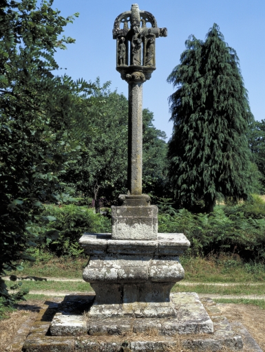 Le calvaire est à deux faces ajourées sous un larmier en demi-cercle. Il est séparé du fût par un noeud. Les bras de la croix sont fleuronnés. L'ensemble repose sur un soubassement en forme d'autel galbé et un double socle monolithe alternativement cubique puis circulaire, orné de boules.