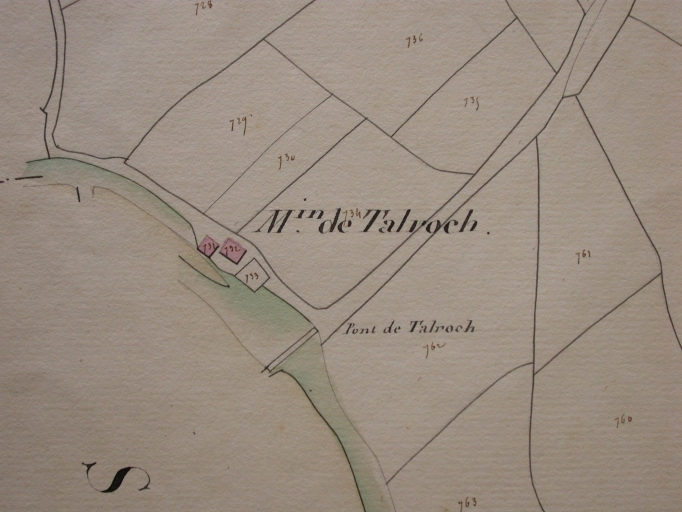 Le moulin de Talroc'h est situé sur la rive gauche de la Sarre. Les deux corps de bâtiments qui le composent sont contemporains ; ils semblent avoir été reconstruits en 1891 (date portée sur une fenêtre du moulin proprement dit) sur l'emplacement d'un moulin plus ancien comme en témoigne un plan daté de 1859. La disposition des bâtiments diffère un peu entre les deux dates : la maison d'habitation perpendiculaire au moulin n'est pas accolée en 1859. L'étable en alignement du logis ne figure pas encore sur le plan. Son pignon était découvert à l'origine. Au début du 20e siècle la fenêtre du logis, à l'étage, est transformée en porte, desservie par un escalier extérieur moderne afin de faciliter le transport du grain. Celle du rez-de-chaussée s'est vue élargie récemment.