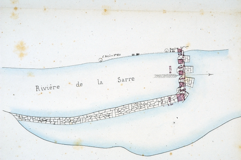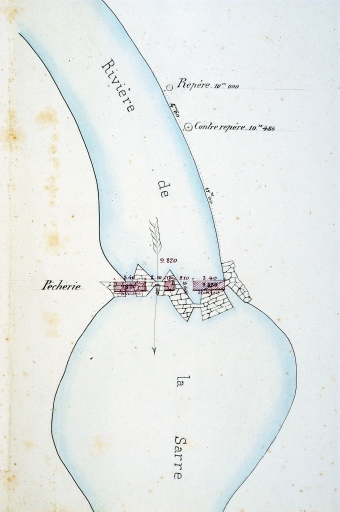 Le plan des pêcheries varie d'un exemple à l'autre. Le premier type de plan présente un massif en maçonnerie de pierres sèches reliant les deux rives de la Sarre (cf. pêcherie près de Kerbihan). Le deuxième type de plan consiste en un massif établi perpendiculairement à une rive et s'avançant jusqu'au milieu de la rivière, relié à la rive opposée par un barrage plus ou moins long (cf. pêcheries près de Saint-Rivalain, à l'aval du moulin du Bourdoux et en amont du moulin du Poul). Enfin, le troisième type de plan montre un massif établi au milieu de la rivière et relié aux deux rives par deux jetées (cf. pêcherie près du Fos). Les ouvertures ou pertuis sont au nombre de 3, 4 ou 5 suivant les cas. Ces ouvertures sont les pêcheries elles-mêmes dans lesquelles on place les guideaux, sorte de montants en bois destinés à maintenir les filets pendant les crues. Les textes du règlement d'eau nous apprennent également que les barrages de pêcherie pouvaient servir de passage aux piétons désirant se rendre au bourg et dans les communes voisines, que les voitures passaient parfois à gué à l'aval de la pêcherie.