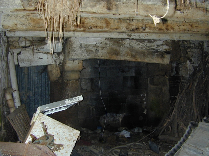Les cheminées sont toujours placées en pignon. Sur l´ensemble des maisons qui ont pu être visitées, seule une au Grand Resto présente une cheminée simple à linteau et consoles en bois. Les autres cheminées appartiennent à des maisons antérieures au 19e siècle et sont toutes à linteau et consoles moulurées en granite. Certaines d´entre elles possèdent deux niches dans le choeur (le Strat, ferme repérée, fig. 36, Kercadoret, Kerhervé). En outre, à Coëtmenan et dans la ferme de la Motte, la dalle du foyer est surélevée sur une série de trois niches en plein cintre (fig.37). Il est possible que ce dispositif, fréquent à Melrand, soit une modification postérieure à la construction. La maison du bourg (AD 95) du 16e siècle est la seule dont les cheminées de l´étage ont été vues. Cependant, Kertanguy en possédait une, déjà tombée lors de l´enquête, de même que les deux fermes de Kerroc´h, à Pradigo, Coëtmenan, mais aussi à Lezerhy, dont seul l´étage est habitable.