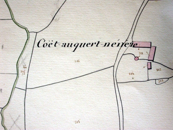 Ferme homogène datée 1884 sur la porte du logis, reconstruite à l'emplacement d'une ferme isolée plus ancienne figurant sur le cadastre ancien de 1828.