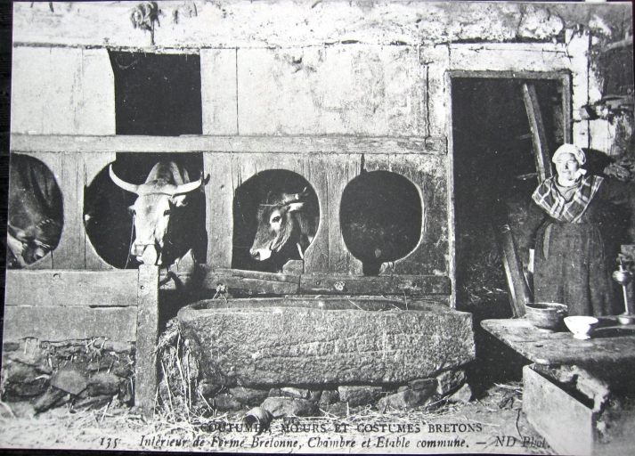 La ferme ne compte de foyer qu´à l´étage, accessible par un escalier dans oeuvre ou extérieur. L´étable occupe le rez-de-chaussée. Le logis domine ainsi les autres parties agricoles de l´exploitation, souvent rejetées dans des bâtiments en alignement. Ce type caractérise la construction la plus ancienne de la commune (cf. Talhouët Saint-Adrien, fig.42).