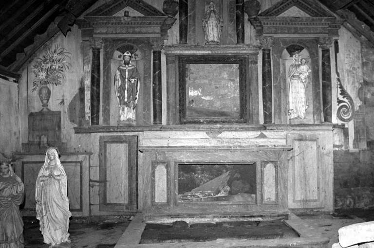 Armoiries non identifiées au-dessus de la porte nord. Armoiries illisibles (bûchées ?) sur pignon est.