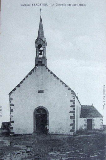 La chapelle primitive figurée sur le plan cadastral de 1811 est correctement orientée. Elle est réédifiée en 1899, à l'initiative du recteur Camper, qui la fait rebâtir suivant une orientation nord-sud. Son clocheton élancé fut dessiné par l'abbé Le Trouher d'après le chanoine Danigo. Vers 1910-1920 on augmente l'édifice d'une tribune extérieure en abside afin de pourvoir aux célébrations extérieures du pardon du dernier dimanche d'août, qui pouvait rassembler 5 à 6 mille pèlerins. Vers 1930 (Danigo), le recteur la fit couvrir d'un berceau en béton que l'on du maintenir quelques temps plus tard par des colonnes intérieures et des contreforts extérieurs également en béton armé. 1944, l'armée allemande occupe le site. Autel, vitraux et clocheton sont endommagés. Entre 1995 et 1997, l'association aidée par Breiz Santel entrepris de supprimer les structures en béton des années 1930, sous la houlette de l'architecte Léo Goas-Straaijer. Son attribution aux "septs saints" se réfère aux sept saints fondateurs des évêchés de Bretagne, à l'origine du pèlerinage du Tro-Breiz.