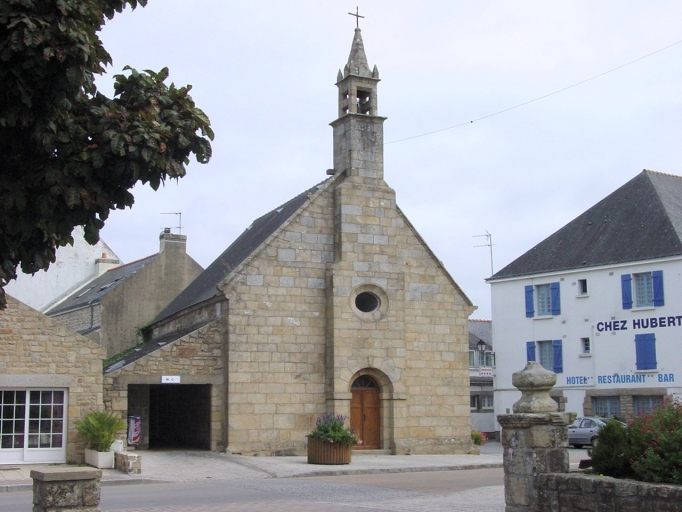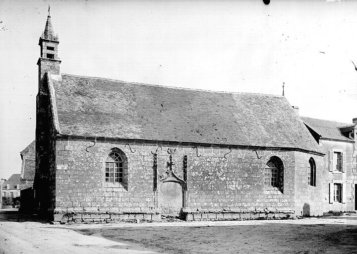 Edifiée au centre du bourg la chapelle de Langroez est située à proximité immédiate de l'église paroissiale, comme à Ploëmel où sont juxtaposés deux sanctuaires. Elle est aujourd'hui de plan rectangulaire court, à chevet polygonal. On doit se référer à la documentation de la seconde moitié du 19e siècle pour avoir une description originale de la chapelle à chevet plat épaulée de contreforts d'angles à pinacles (Rosenzweig, 1963, conf. annexe n°1). L'édifice est construit en pierre de taille de moyen appareil, avec calages d'ardoises. Il est couvert d'un toit de long pan, avec pignon découvert à l'ouest et croupes sur les pans coupés à l'est. Petite sacristie dissimulée dans l'angle nord-est. Les élévations nord et est sont dissimulées par des constructions mitoyennes.Trace d'une porte et d'une baie rectangulaire à large ébrasement intérieur (bouchée), au nord. La façade sud présente une porte, en place, ornée d'un décor Renaissance (ISMH). La façade occidentale avec son clocheton supporté par un massif légèrement saillant, est un remontage de celle élevée au 19e siècle. Un banc extérieur est partiellement conservé côté sud. A l'intérieur, vestige d'un bénitier à l'ouest dont le décor est cassé, d'une crédence à colonnettes, dont la partie supérieure est également tronquée par le percement d'une fenêtre. Un berceau lambrissé récent masque les anciens dispositifs de couvrement.