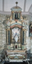 Eglise paroissiale en pierre de taille de granite de plan en croix latine avec chevet et bras du transept polygonaux. La sacristie à étage a été construite dans le prolongement de l'abside. Le porche occidental est surmonté d'un clocher. Au quatrième niveau, la flèche pyramidale, reposant sur un tambour octogonal, est construite en retrait et cernée d'une balustrade à pinacles.
