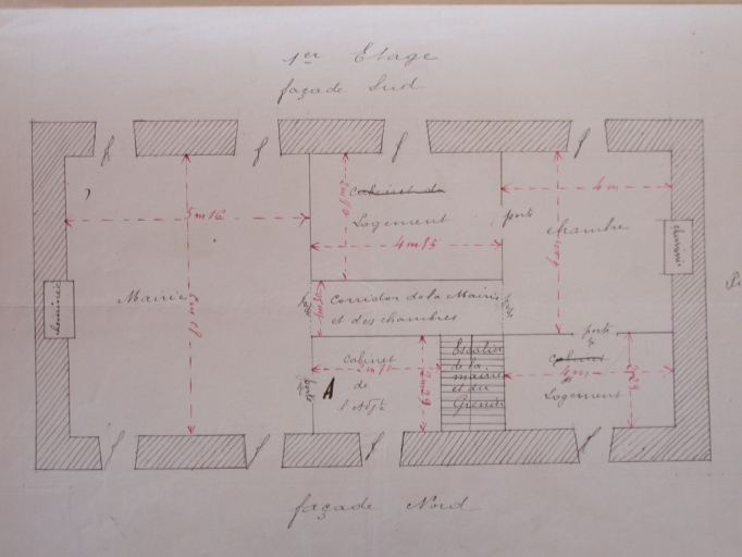 C'est en 1849 que s'élabore le projet d'une maison d'école-mairie, sous le mandat de maire de Mr Naizain. L'architecte en est M. Marsille, architecte d'arrondissement, le plan date du 8 Septembre 1849. Les travaux sont adjugés à Ange-Marie Corbel, maitre-menuisier et entrepreneur à Pontivy. Le devis se monte à 6525 francs. Le bâtiment est achevé en 1854, ainsi que le montre le procès-verbal de réception définitive des travaux dressé le 5 juin 1854. Il a été conçu initialement comme école de garçons, logement de l'instituteur et mairie. En 1855, des latrines sont ajoutées et la cour de l'école est enclose. En 1906, la préfecture décide d'office contre l'avis de la commune de faire construire sur des plans de l'architecte Edouard Ramonatxo, architecte de la ville de Pontivy, par Jarno, entrepreneur à Guénin, deux nouvelles salles de classe dans le jardin et d'utiliser une grande partie de l'école comme mairie (les logements des instituteurs demeurant à l'étage). Les travaux sont achevés en 1912. Les planchers s'effondrent dès 1920 et sont refaits. En 1983, l'ancienne mairie-école est transformée en logements.