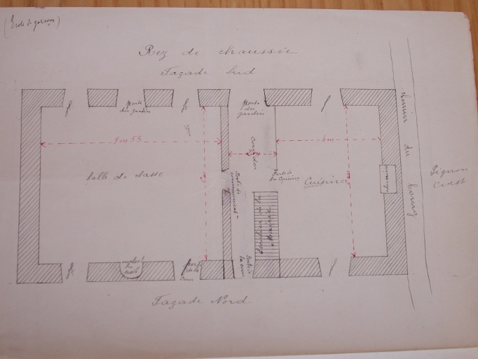 Relativement précurseur en matière de construction d'école (certaines communes du canton attendirent la fin du 19e siècle pour se doter de cet équipement imposé par les circulaires officielles), la commune de Guénin construit un bâtiment compact, à plan double en profondeur, d'une typologie assez différente des modèles en usage où la salle de classe était souvent logée dans une aile en alignement de la mairie et logement de l'instituteur : ici la salle de classe, ainsi que la cuisine occupe le rez-de-chaussée, l'étage étant réservé à la mairie et au logement de l'instituteur.