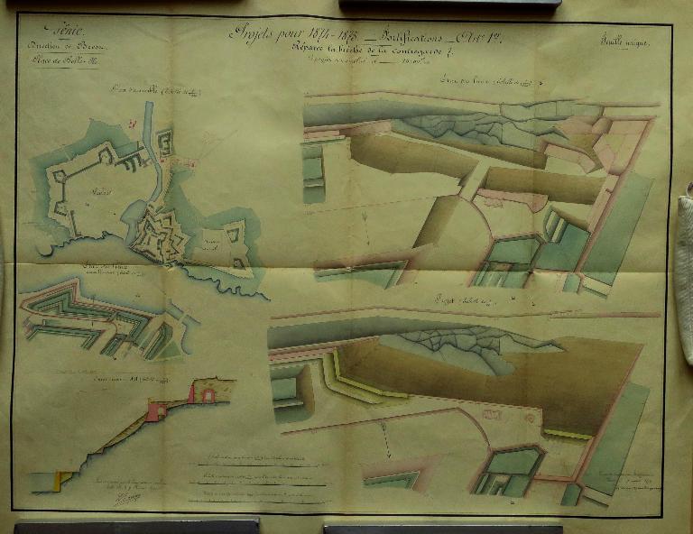 Lorsque Vauban arrive à Belle-île, il dispose déjà d'un plan de la citadelle établi en 1680 (quoique légèrement erroné !). Son projet directeur du 30 mars 1683 comprend un plan général du bourg du Palais et de la citadelle, un plan particulier et plus intéressant : des élévations et développements de chaque front de la citadelle montrant la hauteur d´avant sa visite et celle projetée. Vauban "l'attaquant" décrit le point faible de la place : "De l'autre côté, il y a un grand vallon où la place ne se voit point, dans lequel deux enfoncements à peu près parallèles se viennent rendre, ce vallon qui peut servir de tranchée depuis son ouverture jusqu'à la portée du pistolet de la place, est et sera toujours le vrai chemin des attaques tant que le bourg ne sera pas fortifié, et ce d'autant plus qu'il y conduit l'ennemi presque à couvert... [...]. Le bourg contient quelque deux cent soixante dix maisons assez bien bâties, et en contiendrait bien davantage s'il était fermé".