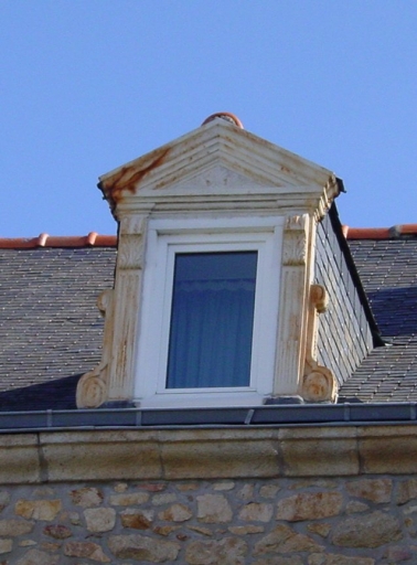 Lucarnes en fonte à volutes, pilastres cannelés et palmes.