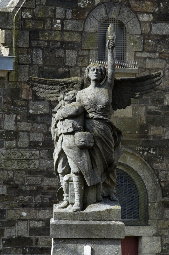Figure allégorique ailée représentant la Victoire, brandissant un glaive et soutenant un poilu agonisant.